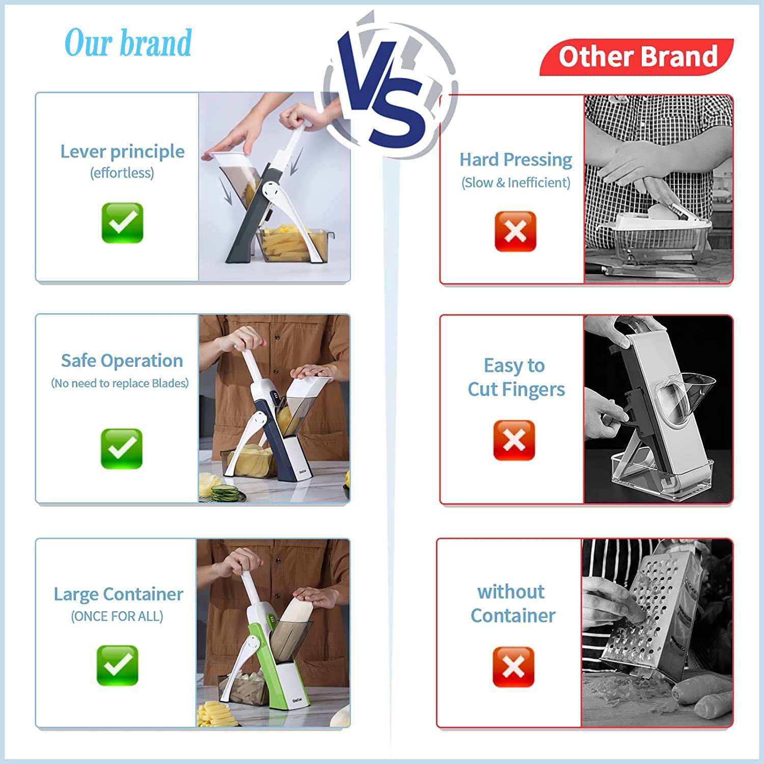 Our mandoline slicer is designed with built-in blades, eliminating the need to touch sharp edges or change blades manually. It's safer than traditional slicers and doesn't require safety gloves. Ideal for elderly users and children under supervision.